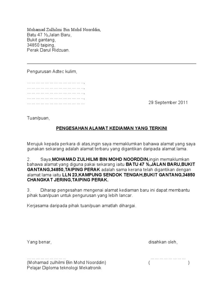 Alamat tempat tinggal sekarang : surat pengesahan tempat tinggal. Berlaku pertukaran kediaman serta tinggal menetap di tempat bahari selama .